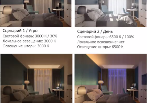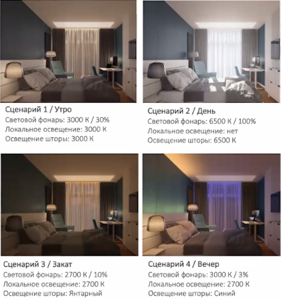 | Рабочий кабинет | Высокий | Холодный | Регулировка по времени суток и яркости |